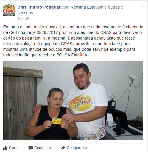 “Em uma atitude muito louvável, a senhora que carinhosamente é chamada de Celitinha, hoje 08/05/2017, procurou a equipe do CRAS para devolver o cartão do bolsa família, a mesma já aposentada achou justo que fosse feita a devolução. A equipe do CRAS aproveita a oportunidade para mostras uma atitude de poucos mas, que pode servir de exemplo para todos cidadão que recebe o BOLSA FAMÍLIA”, diz texto publicado no Facebook do CRAS daquela cidade.