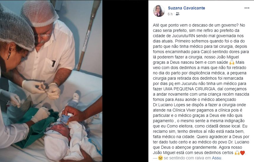 “Primeiro sofremos quando foi o dia do parto que não tinha médico para tal cirurgia, depois fomos encaminhado para Caicó sentindo dores para lá poderem fazer a cirurgia, nosso João Miguel graças a Deus nasceu bem e com saúde, mais veio com dois dedinhos a mais que não foi retirado no dia do parto por displicência médica, a pequena cirurgia para retirada dos dedinhos foi remarcada por dias pq em Jucurutu não tinha um médico para fazer UMA PEQUENA CIRURGIA, daí começamos a andar novamente com uma criança recém nascida fomos para Assu aonde o médico abençoado Dr.Luciano Lopes se dispôs a fazer a cirurgia onde atende na Clínica Viver, pagamos a clínica pois é particular e o médico graças a Deus ele não quis pagamento, o mesmo sente a mesma indignação que eu como eleitora, como cidadã desse local”.