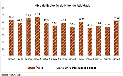 O indicador do nível de atividade aumentou 8,4 pontos em junho de 2023, passando de 42,6 para 51,0 pontos, revelando crescimento em relação ao mês anterior. Na comparação com igual mês de 2022, o índice recuou 2,2 pontos (53,2 pontos), sinalizando que a atividade se encontrava, então, mais aquecida.