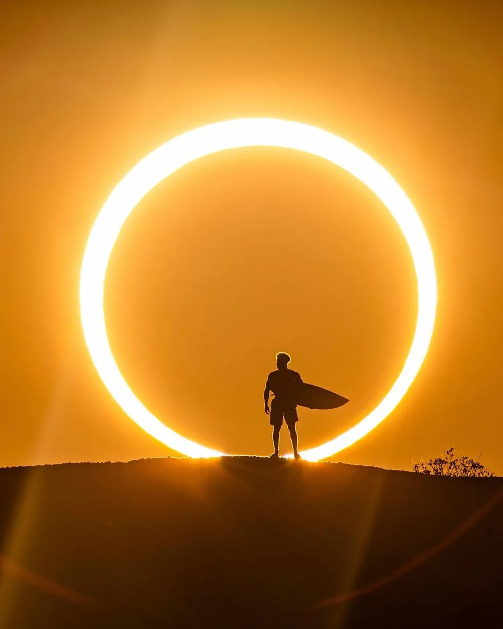 O campeão olímpico Italo Ferreira compartilhou neste sábado um ensaio fotográfico realizado durante o eclipse solar anular. O surfista parece estar dentro de um “arco de fogo”. As fotos são de Marcelo Maragni e foram feitas em Baía Formosa, cidade onde o surfista nasceu.